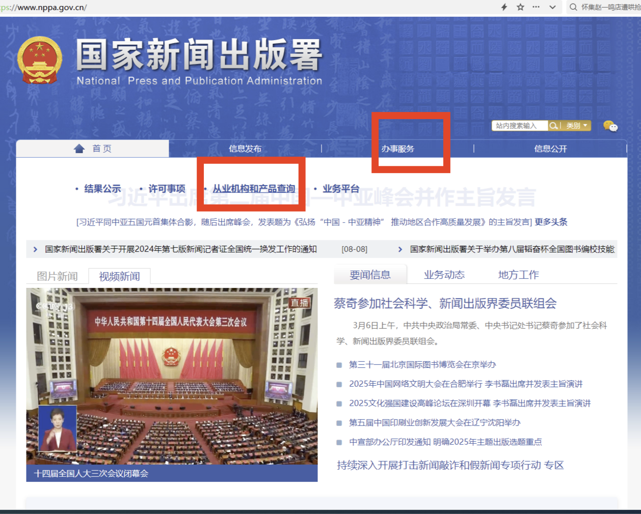 本刊在中华人民共和国国家新闻出版广电总局的网上查询路径具体如下: 中华人民共和国国家新闻出版广电总局网站主页:https://www.nppa.gov.cn/ 详细图解如下: