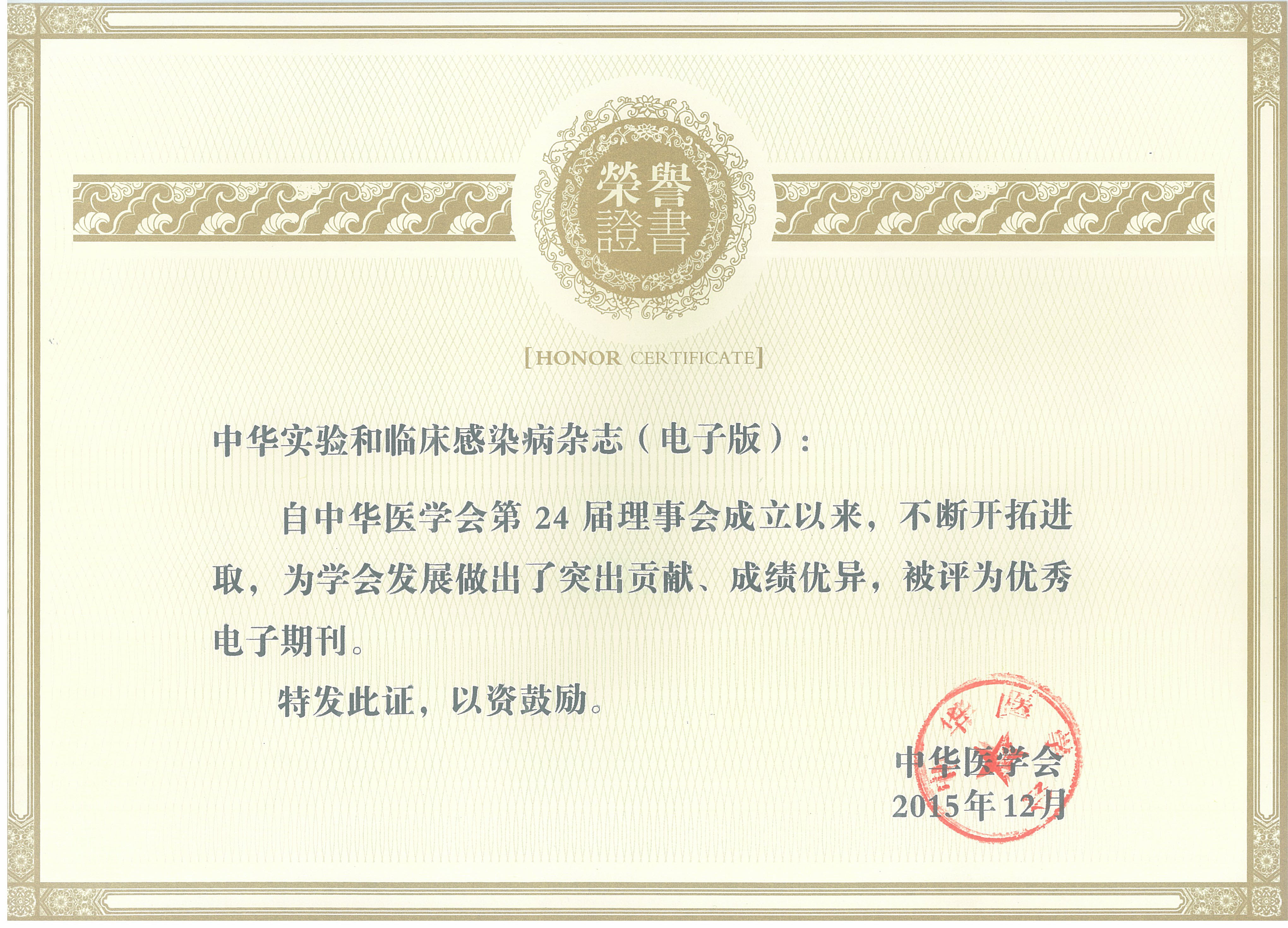2015年12月14日,中华医学会第25次全国会员代表大会暨成立100周年纪念大会在人民大会堂隆重召开,《中华实验和临床感染病杂志(电子版)》作为“优秀电子期刊”荣获表彰。 感谢为了本刊的发展做出贡献的广大专家同仁、编委、作者和读者,衷心感谢您们给予本刊的支持和帮助! |